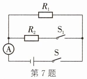 7.(合肥二模)如图所示的电路,电源电压保持不变,定值电阻R₁的阻值为15Ω,只闭合开关S₁,电流表的示数为0.2A;再闭合开关S₂,此时电路的总功率为1.5W,则定值电阻R₂的阻值是________Ω。