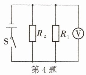 4.(牡丹江中考)如图所示,R₁ = 10Ω,R₂ = 5Ω,闭合开关,电压表的示数为3V,电源电压U = ________V,R₁的电功率P₁ = ________W,通电10s后,R₂消耗的电能W₂ = ________J。