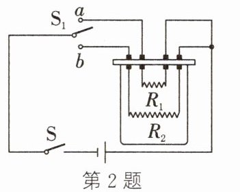 2.小强同学利用家庭实验室中的器材,设计了一个可调节功率的简易“电饭锅”,如图所示,电源电压为6V,电阻丝R₁ = 5Ω,R₂ = 15Ω,a、b是两个触点。闭合开关S,当开关S₁接触点________时,“电饭锅”的功率更大。将R₂接入电路工作3min产生的热量是________J。