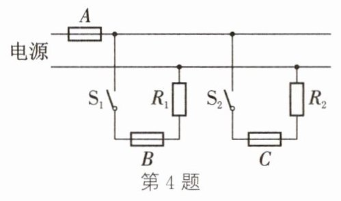 4.保险丝能感应电器、电子产品非正常运作中产生的热量,从而自动切断回路以避免火灾的发生。如图所示为某电子产品中的电路,A是一根7A的保险丝,B、C都是5A的保险丝。R₁ = 16Ω,R₂ = 10Ω。开关S₁断开、S₂闭合时,通过R₂的电流是4.8A。当S₁、S₂同时闭合时,A、B、C三根保险丝中将熔断的是________。