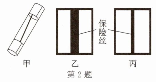 2.为了防止电流过大将用电器核心部件烧毁,很多用电器都装有保险管,如图甲所示。乙、丙两图分别是两个保险管的截面图,若两管内保险丝的材料相同,长度相同,粗细不同,则两图中________图保险丝允许通过的电流大。当两保险管通过相同的电流时,________图保险丝更容易熔断。(填“乙”或“丙”)。