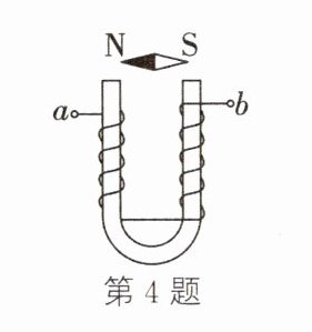 4.某同学绕制了一个蹄形电磁铁,通电后电磁铁上方的小磁针的指向如图所示,由此可判断导线a端与电源的________(填“正"或“负”极相连。