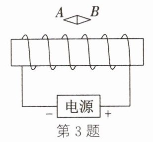 3.(2023.合肥期末)如图所示,通电螺线管上方有一个小磁针,则小磁针静止时S极在________(填“A"或“B")端。