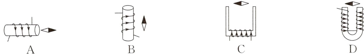 8.如图所示,在通电螺线管(导线中箭头表示电流方向)附近放置的小磁针(黑端为N极),静止时其指向正确的是( )