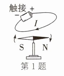 1.如图所示,桌面上有一枚转动灵活的小磁针,当导线与电池触接时,小磁针发生偏转,说明通电导线周围存在________;断开电路,小磁针________(填“会"或“不会”)回到原来位置。