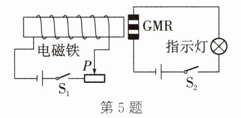 5.(张家界中考)如图所示为研究巨磁电阻(GMR)特性的原理示意图,已知巨磁电阻阻值随磁场强度的增大而急剧减小,闭合开关S、S₂后,电磁铁右端为________极,滑片P向左滑动的过程中,指示灯明显变________(填“亮"或“暗")。