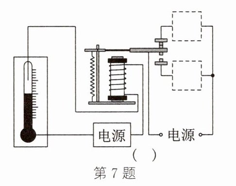 7.(营口中考)某温度自动报警器的原理图如图所示。电磁铁上端为N极,在水银温度计中封入一段金属丝,当温度低于设定温度时,只有安全指示灯常亮;当温度达到设定温度时,安全指示灯熄灭,电铃发出报警信号。请在括号中标出电源的极性(用“十"或“一”表示),并在虚线框内填入电铃(R)和指示灯的电路元件符号。