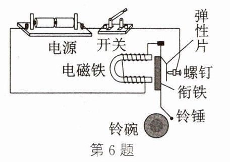 6.如图所示为直流电铃的工作原理示意图。铃锤与衔铁一端固定,衔铁与弹性片相连,在自然情况下弹性片是和螺钉接触的。接通电源,电磁铁具有________从而吸引衔铁,铃锤敲击铃碗发声,同时弹性片与螺钉________导致断电,此时电磁铁释放衔铁,弹性片又和螺钉________使电路通电,如此往复循环。