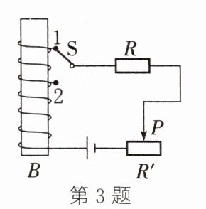 3.(2023.马鞍山一模)如图所示,B是通电螺线管(电阻忽略不计),S是转换开关,保持滑片位置不变,当开关S位置由2改接到1时,电磁铁的磁性________(填“增强"或“减弱”)。