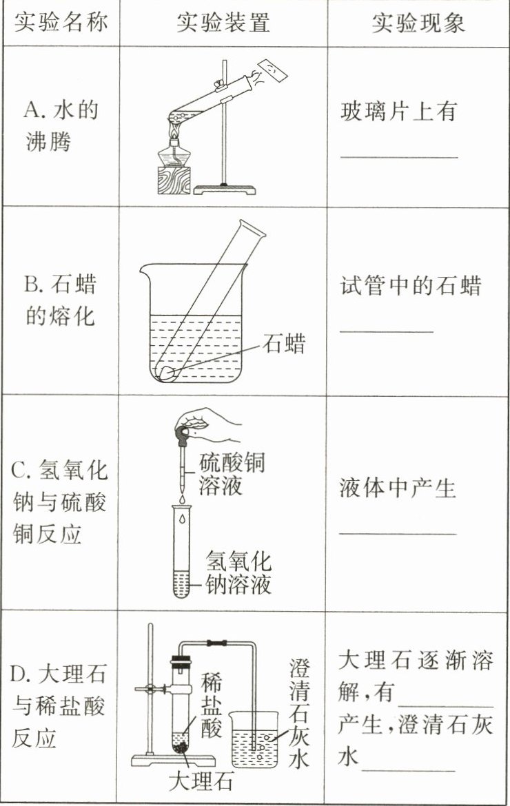水雾 由固态变为液态 蓝色沉淀 气泡 变浑浊