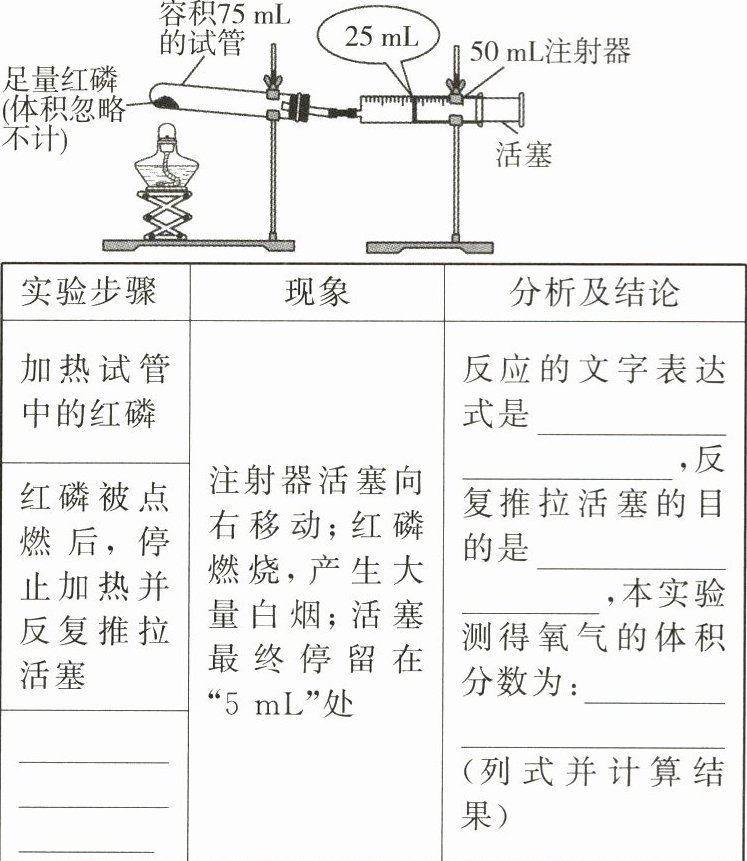 红磷+氧气$\xrightarrow{点燃}$五氧化二磷 促进气体流动,使氧气完全反应 $\frac{25\ mL - 5\ mL}{25\ mL + 75\ mL}×100\% = 20\%$