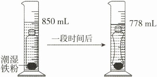 4. 铁生锈会消耗氧气,用如图装置测定空气中氧气的含量。量筒中先装入一定量的水,再将装有足量潮湿铁粉的矿泉水瓶(有效容积为345 mL)旋紧瓶盖放入其中,观察瓶子不再变瘪,记录反应前后数据如图所示。下列说法不正确的是( )