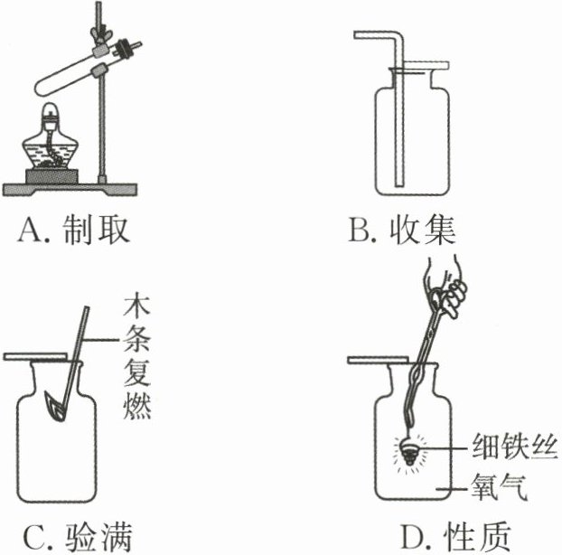 1. 化学实验基本操作是培养学生化学核心素养的基础。下列关于高锰酸钾制取氧气、收集、验满、性质的操作中,正确的是 ( )