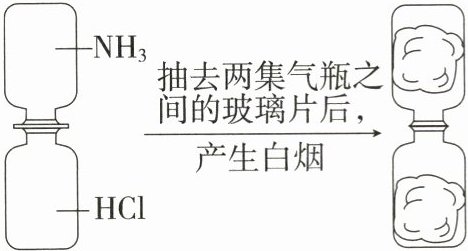 11. 如图,两集气瓶中分别装满氨气(NH₃)和氯化氢(HCl)气体,抽去两集气瓶之间的玻璃片,二者接触后会产生大量白烟,白烟是氯化铵固体小颗粒。据此回答下列问题: