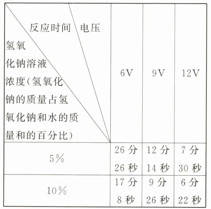 实验过程中,同学们发现调节电压或在水中加入少量氢氧化钠都会改变电解速率。于是他进行了多次实验,将实验数据取平均值。记录如下。(保持其他条件不变,每次实验收集10 mL氧气)