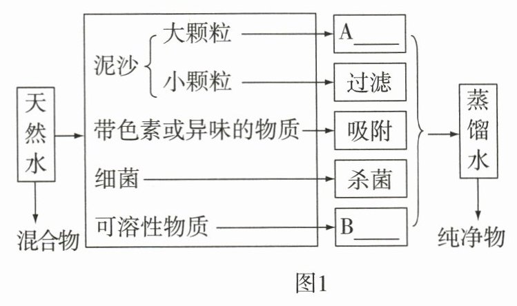 (2)从天然水净化为蒸馏水的过程中方框A表示_______,B表示_______。