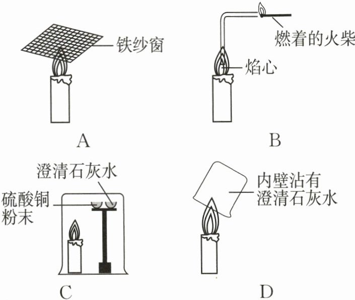 (1)如图A,点燃蜡烛,取一片铁纱窗罩在火焰中心,观察到外焰处的铁纱窗出现红热的环,内焰及焰心处的铁纱窗无明显变化,该实验说明________________________。