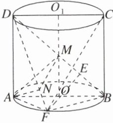 如图,在圆柱 $ O_1O $ 中,轴截面 $ ABCD $ 为正方形,点 $ F $ 是 $ \overset{\frown}{AB} $ 上一点,$ M $ 为 $ BD $ 与轴 $ O_1O $ 的交点,$ E $ 为 $ MB $ 的中点,$ N $ 为 $ A $ 在 $ DF $ 上的射影,且 $ EF // $ 平面 $ AMN $,则下列选项正确的有(