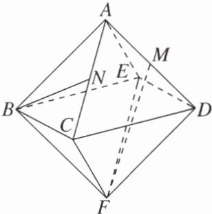 则$B(0, - \sqrt{2},0)$,$C(\sqrt{2},0,0)$,$A(0,0,\sqrt{2})$,$D(0,\sqrt{2},0)$,$F(0,0, - \sqrt{2})$, 所以$N(\frac{\sqrt{2}}{2},0,\frac{\sqrt{2}}{2})$,$M(0,\frac{\sqrt{2}}{2},\frac{\sqrt{2}}{2})$, $\overrightarrow{BN} = (\frac{\sqrt{2}}{2},\sqrt{2},\frac{\sqrt{2}}{2})$,$\overrightarrow{FM} = (0,\frac{\sqrt{2}}{2},\frac{3\sqrt{2}}{2})$, 所以$|\cos\langle\overrightarrow{BN},\overrightarrow{FM}\rangle| = \frac{|\overrightarrow{BN} \cdot \overrightarrow{FM}|}{|\overrightarrow{BN}||\overrightarrow{FM}|}$ $ = \frac{\frac{5}{2}}{\sqrt{3} × \sqrt{5}} = \frac{\sqrt{15}}{6}$, 即直线$BN$和$FM$夹角的余弦值为$\frac{\sqrt{15}}{6}$. 法二 由题意,可得$\overrightarrow{BN} = \overrightarrow{AN} - \overrightarrow{AB} = \frac{1}{2}\overrightarrow{AC} - \overrightarrow{AB}$,$\overrightarrow{FM} = \overrightarrow{FD} + \overrightarrow{DM} = \overrightarrow{BA} + \overrightarrow{DM} = - \frac{1}{2}\overrightarrow{AD} - \overrightarrow{AB}$, 连接$BD$(图略),由正八面体$ABCDEF$的棱长都是$2$,且各个面都是等边三角形,易知四边形$BCDE$为正方形, 在$\triangle ABD$中,由$AB = AD = 2$, 可得$AB^{2} + AD^{2} = BD^{2}$, 所以$AB \perp AD$, 所以$\overrightarrow{FM} \cdot \overrightarrow{BN}$ $= (-\frac{1}{2}\overrightarrow{AD} - \overrightarrow{AB}) \cdot (\frac{1}{2}\overrightarrow{AC} - \overrightarrow{AB})$ $= -\frac{1}{4}\overrightarrow{AD} \cdot \overrightarrow{AC} + \frac{1}{2}\overrightarrow{AD} \cdot \overrightarrow{AB} - \frac{1}{2}\overrightarrow{AB} \cdot \overrightarrow{AC} + \overrightarrow{AB}^{2}$ $= -\frac{1}{4} × 2 × 2 × \frac{1}{2} + 0 - \frac{1}{2} × 2 × 2 × \frac{1}{2} + 2^{2}$ $= -\frac{1}{2} - 1 + 4 = \frac{5}{2}$, $|\overrightarrow{BN}| = \sqrt{(\frac{1}{2}\overrightarrow{AC} - \overrightarrow{AB})^{2}}$ $= \sqrt{\frac{1}{4}\overrightarrow{AC}^{2} - \overrightarrow{AC} \cdot \overrightarrow{AB} + \overrightarrow{AB}^{2}}$ $= \sqrt{\frac{1}{4} × 2^{2} - 2 × 2 × \frac{1}{2} + 2^{2}} = \sqrt{3}$, $|\overrightarrow{FM}| = \sqrt{(-\frac{1}{2}\overrightarrow{AD} - \overrightarrow{AB})^{2}}$ $= \sqrt{\frac{1}{4}\overrightarrow{AD}^{2} + \overrightarrow{AD} \cdot \overrightarrow{AB} + \overrightarrow{AB}^{2}}$ $= \sqrt{\frac{1}{4} × 2^{2} + 0 + 2^{2}} = \sqrt{5}$, 所以$|\cos\langle\overrightarrow{FM},\overrightarrow{BN}\rangle| = \frac{|\overrightarrow{FM} \cdot \overrightarrow{BN}|}{|\overrightarrow{FM}||\overrightarrow{BN}|}$ $ = \frac{\frac{5}{2}}{\sqrt{5} × \sqrt{3}} = \frac{\sqrt{15}}{6}$, 即直线$BN$和$FM$夹角的余弦值为$\frac{\sqrt{15}}{6}$.]