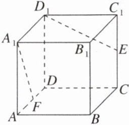 (2)以$D$为原点,以$DA$,$DC$,$DD_1$所在直线分别为$x$,$y$,$z$轴,建立空间直角坐标系(图略).正方体的棱长为$2$,则 $A_1(2,0,2)$,$D_1(0,0,2)$,$E(0,2,1)$,$A(2,0,0)$. 所以$\overrightarrow{D_1E} = (0,2, - 1)$, $\overrightarrow{A_1F} = \overrightarrow{A_1A} + \overrightarrow{AF} = \overrightarrow{A_1A} + \lambda\overrightarrow{AD}$ $= (0,0, - 2) + \lambda( - 2,0,0) = ( - 2\lambda,0, - 2)$. 则$|\cos\langle\overrightarrow{A_1F},\overrightarrow{D_1E}\rangle| = \frac{|\overrightarrow{A_1F} \cdot \overrightarrow{D_1E}|}{|\overrightarrow{A_1F}| \cdot |\overrightarrow{D_1E}|}$ $ = \frac{2}{2\sqrt{\lambda^{2} + 1} \cdot \sqrt{5}} = \frac{3\sqrt{2}}{10}$, 解得$\lambda = \frac{1}{3}$(舍去$- \frac{1}{3}$).]
