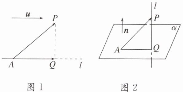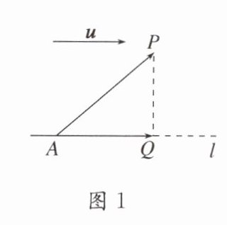 如图 1,已知直线 $ l $ 的单位方向向量为 $ \boldsymbol{u} $,$ A $ 是直线 $ l $ 上的定点,$ P $ 是直线 $ l $ 外一点,设 $ \overrightarrow{AP} = \boldsymbol{a} $,则向量 $ \overrightarrow{AP} $ 在直线 $ l $ 上的投影向量 $ \overrightarrow{AQ} = (\boldsymbol{a} \cdot \boldsymbol{u})\boldsymbol{u} $. 在 $ Rt \triangle APQ $ 中,由勾股定理,得 $ PQ = \sqrt{|\overrightarrow{AP}|^2 - |\overrightarrow{AQ}|^2} = $