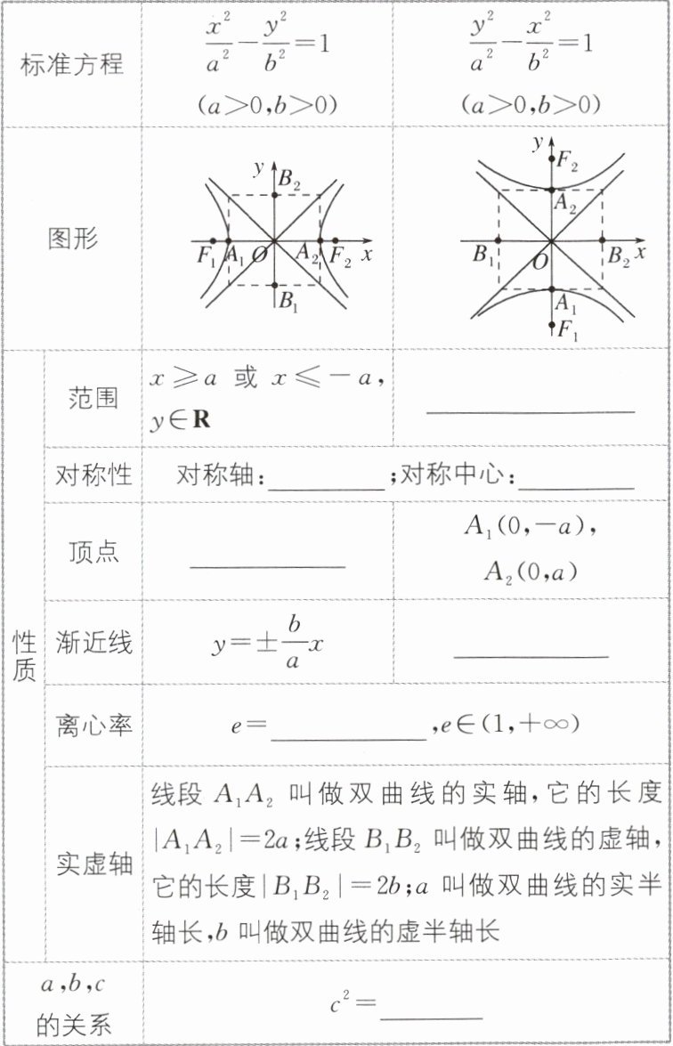 2.$x\in \mathbf{R},y\leqslant -a$ 或$y\geqslant a$ 坐标轴 原点 $A_1(-a,0),A_2(a,0)$ $y = \pm \frac{a}{b}x$ $\frac{c}{a}$ $a^{2}+b^{2}$