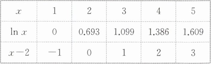 (1)设$f(x)=\ln x-x+2 =\ln x-(x-2),$易知函数f(x)在(1,+∞)上的图象连续,由表格数据得$f(1)>0,f(2)>0,f(3)=\ln 3-(3-2)=1.099-1=0.099>0,f(4)=\ln 4-2=1.386-2<0,$则f