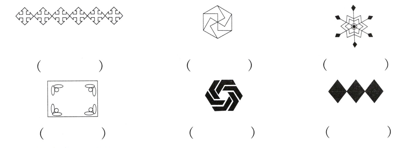 四、先用彩笔圈出每幅图中的基本图案,然后将基本图案变化的方式写在图案下面的括号里(6分)