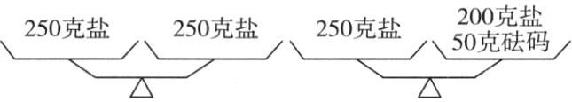5. 要从500克盐中称出200克。只有一架天平和一个50克的砝码,而且限定只允许称两次,应该怎样称?你能试着在下面的图中画一画吗?(8分)