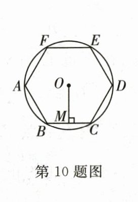 10.如图,正六边形ABCDEF内接于⊙O,⊙O的半径为4,则这个正六边形的边心距OM和BC的长分别为 ( )
