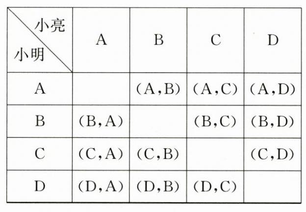 23. (6分)为了增强学生体质,开展体育娱乐教学,某校举行了“趣味运动会”. 运动会的比赛项目有“两人三足”“春种秋收”“有轨电车”“摸石过河”(分别用字母A,B,C,D表示这四个运动项目),将A,B,C,D这四个字母分别写在4张完全相同的不透明卡片的正面上,把这4张卡片背面朝上洗匀后放在桌面上. 小明和小亮参加趣味比赛,比赛时小明先从中随机抽取一张卡片,记录下卡片上的内容,放回后洗匀,再由小亮从中随机抽取一张卡片,选手按各自抽取的卡片上内容进行趣味运动比赛.
