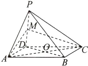 [例3]如图,四棱锥P - ABCD中,底面ABCD是菱形,对角线AC,BD交于点O,M为棱PD的中点,$MA = MC$。求证: