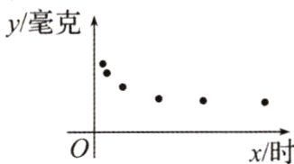 2.(必修第一册P152例6变条件)某校拟用一种喷雾剂对宿舍进行消毒,需对喷雾完毕后空气中每立方米药物残留量$y$(单位:毫克)与时间$x$(单位:时)的关系进行研究,为此收集部分数据并做了初步处理,得到如图散点图. 现拟从下列四个函数模型中选择一个估计$y$与$x$的关系,则应选用的函数模型是 ( )