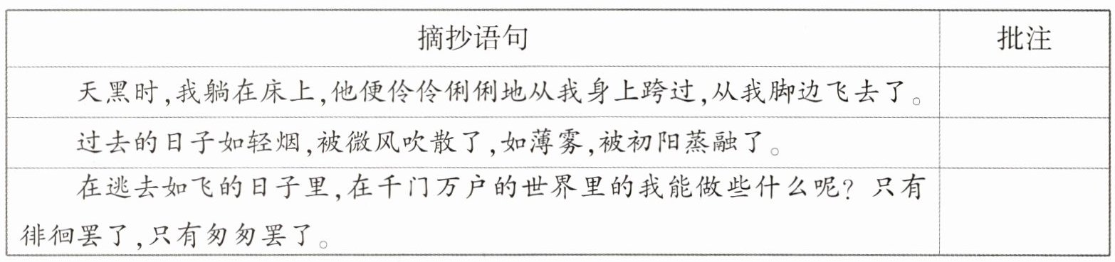 跟着旋转。于是——洗手的时候,日子从水盆里过去;吃饭的时候,日子从饭碗里过去;默默时,便从凝然的双眼前过去;我觉察他去得匆匆了,伸出手遮挽时,他又从遮挽着的手边过去;天黑时,我躺在床上,他便伶伶俐俐地从我身上跨过,从我脚边飞去了;等我睁开眼和太阳再见,这算又溜走了一日;我掩面叹