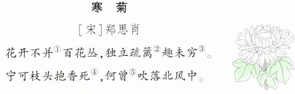 “花开不并百花丛”写出了菊花__________的节操;“独立疏篱趣未穷”写出了菊花__________的心境;诗人借助颇富口语气息的“宁可”“何曾”两个词语,写出了菊花__________的气节。