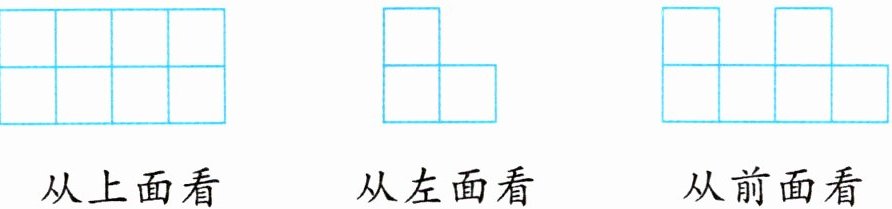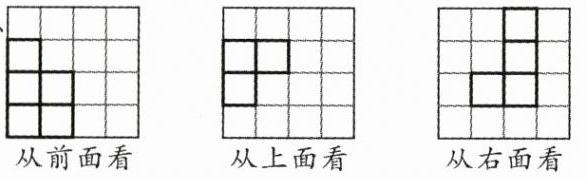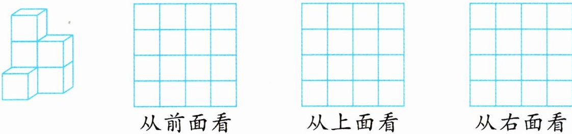 四、在方格纸中把下面立体图形从前面、上面、右面看到的图形画出来。