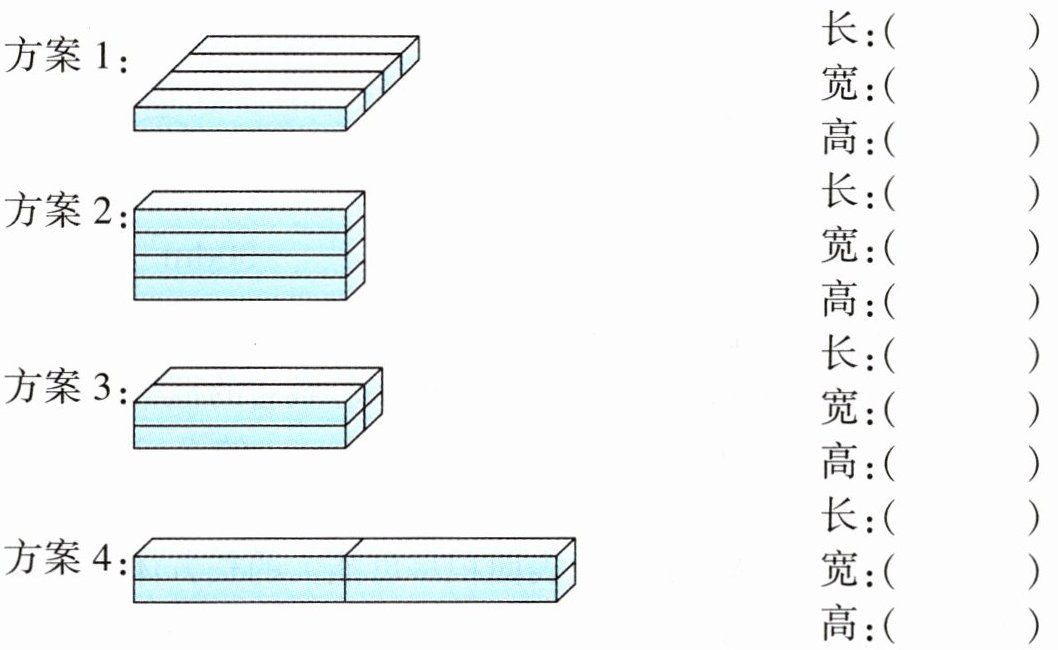 1. 方案1:18cm 20cm 4cm 方案2:18cm 5cm 16cm 方案3:18cm 10cm 8cm 方案4:36cm 5cm 8cm 2. 方案1:$(18×20 + 18×4 + 20×4)×2 = 1024(cm^{2})$ 方案2:$(18×5 + 18×16 + 5×16)×2 = 916(cm^{2})$ 方案3:$(18×10 + 18×8 + 10×8)×2 = 808(cm^{2})$ 方案4:$(36×5 + 36×8 + 5×8)×2 = 1016(cm^{2})$