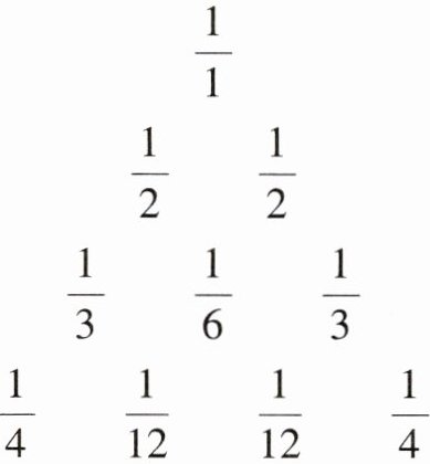 四、下图是一个由数构成的三角形图,叫“莱布尼茨调和三角形”,图中的数都是由整数的倒数组成的,第$n$行有$n$个数,且两端的数均为$\frac{1}{n}$,每个数是它下一行左右相邻两数的和。你能把这个三角形图的下一行写出来吗?