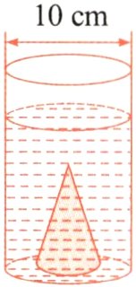 33. 如图,一个圆柱形玻璃容器里装有水,在水里浸没一个底面直径是6 cm、高是1 dm的圆锥形铁块。如果把铁块从圆柱形容器里取出,那么容器里的水面要下降多少厘米?