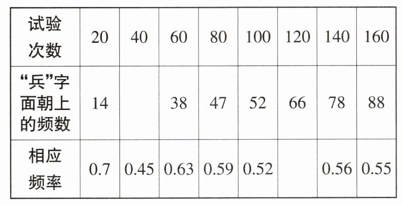 15. 统计结合法数据观念 一粒木质中国象棋棋子“兵”,它的正面雕刻一个“兵”字,它的反面是平的。将它从一定高度掷下,落地反弹后可能“兵”字面朝上,也可能“兵”字面朝下。由于棋子的两面不均匀,为了估计“兵”字面朝上的概率,某试验小组做了棋子下掷试验,试验数据如下表: