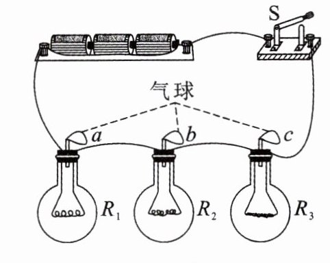 7. 如图所示,将三个相同的空烧瓶口分别用完全相同的气球密封,用三段阻值不同的电阻丝(R1<R2<R3)分别给三个烧瓶中的空气加热,通电一段时间后体积变化最大的气球是