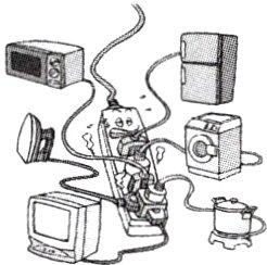 4. 如图所示,通过插座接入电路的用电器同时工作时,电路中用电器的总功率过大,引起干路中的电流__________。根据焦耳定律可知,干路中的电流产生过多的__________,使导线的温度急剧升高,从而烧坏插座和干路的导线,容易引起火灾。