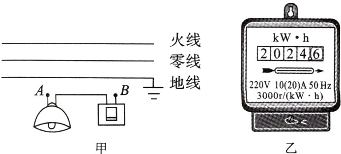 4.(眉山市中考)小龙和父亲一起为家里安装电灯,连接的部分电路如图甲,A、B两接线点,与火线相连的是______点;家里电能表如图乙,原有用电器的总功率是3600W,从电能表使用的角度考虑,还能添加用电器的总功率不超过______W。