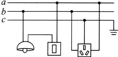 3.(阜新市中考)如图所示a、b、c是家庭电路中的三条导线,其中火线是____(选填“a”“b”或“c”)。若将洗衣机接入此电路中,洗衣机应与电灯____联。当家庭电路需要维修时,必须断开______。