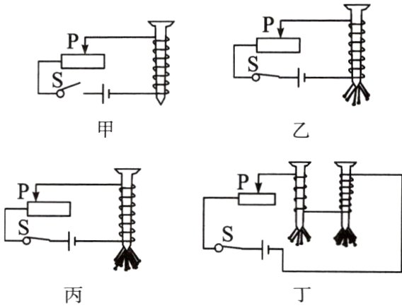 8. 为了探究电磁铁的磁性强弱跟哪些因素有关,小明同学找来一些大头针,然后用漆包线(表面涂有绝缘漆的导线)在大铁钉上绕若干匝,制成简单的电磁铁,图甲、乙、丙、丁为实验中观察到的四种情况。