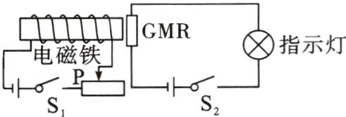 11. 如图是巨磁电阻GMR特性原理的示意图,实验发现,在闭合开关S₁、S₂且滑片P向右滑动的过程中,指示灯明显变暗,这说明( )