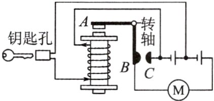 9. 如图是汽车启动装置电路简图,当钥匙插入钥匙孔并转动时,电磁铁得到磁性,此时电磁铁上端为______极,触点B与C ________(选填“接通”或“断开”),汽车启动。