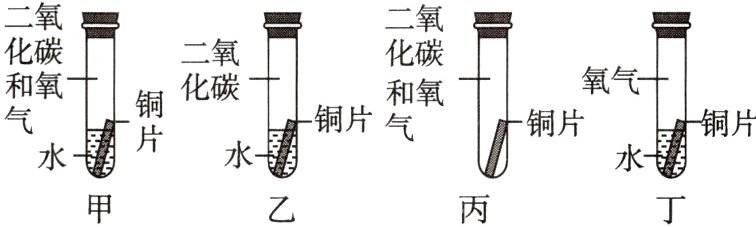 11. (科学思维)(1)某同学根据铜绿的化学式Cu₂(OH)₂CO₃作出猜想:金属铜锈蚀的条件除有氧气和水外,还必须有二氧化碳。为证明“必须有二氧化碳”,需要进行如图所示实验中的__________(填实验编号甲、乙、丙、丁)。