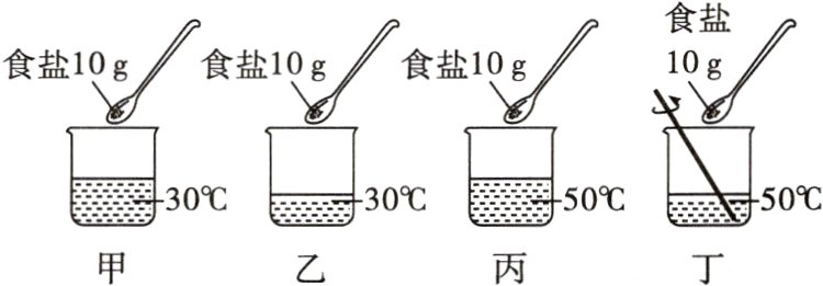 11. 小明探究食盐在水中的溶解情况。他取一只烧杯倒入一定量的水,用药匙将食盐一点点撒入水中,仔细观察食盐的变化直到食盐在水中消失。