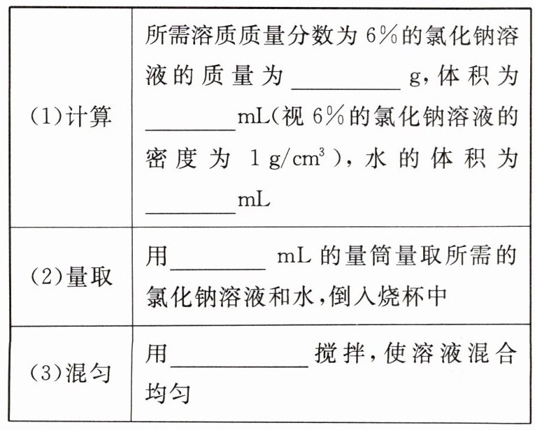 2.用质量分数为6%的氯化钠溶液配制50g溶质质量分数为3%的氯化钠溶液(溶液稀释问题)。